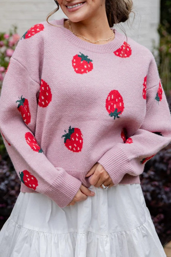 The Berry Bliss Blush Knit Sweater brings a playful pop to your everyday knitwear. Designed with an all-over strawberry print, this sweater features a soft, cozy knit feel with a relaxed fit that’s easy to wear all day long. The classic crew neckline keeps it timeless, while the charming pattern adds a fun, feel-good touch. Pair it with denim, trousers, or a skirt for a look that’s effortlessly cute and comfortably styled.
